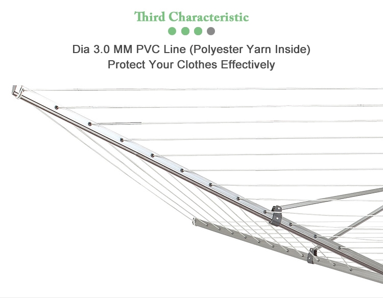 2.Aluminum frame and PVC coated line: Using high-quality aluminum, not easy to rust even in rainy day. The rope is made of PVC wrapped steel wire, which makes the rope not easy to break, and has a better bearing capacity, which can dry a family’s clothes.